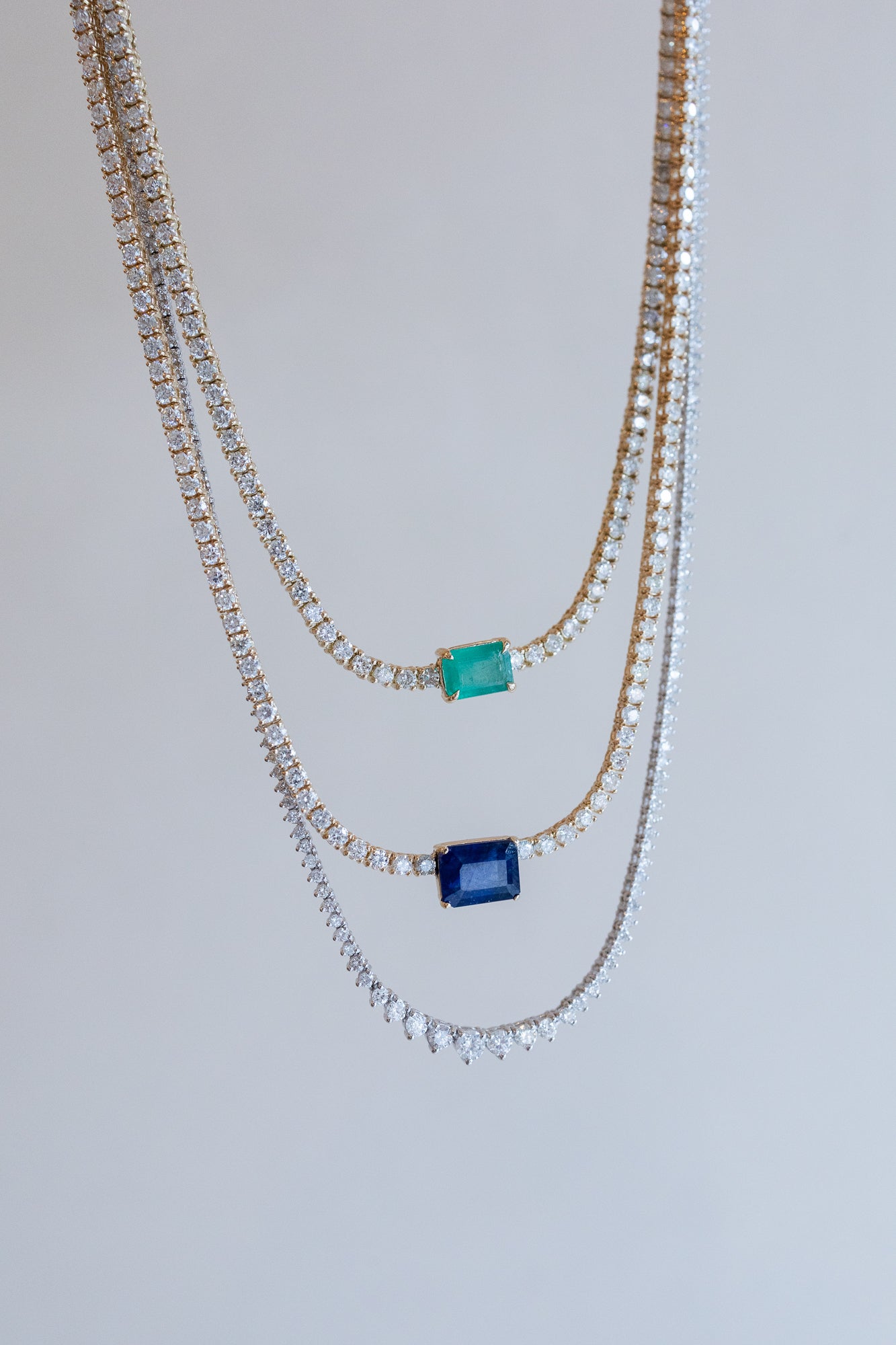 A classic, chic half tennis necklace with an emerald cut emerald. Simply stunning.