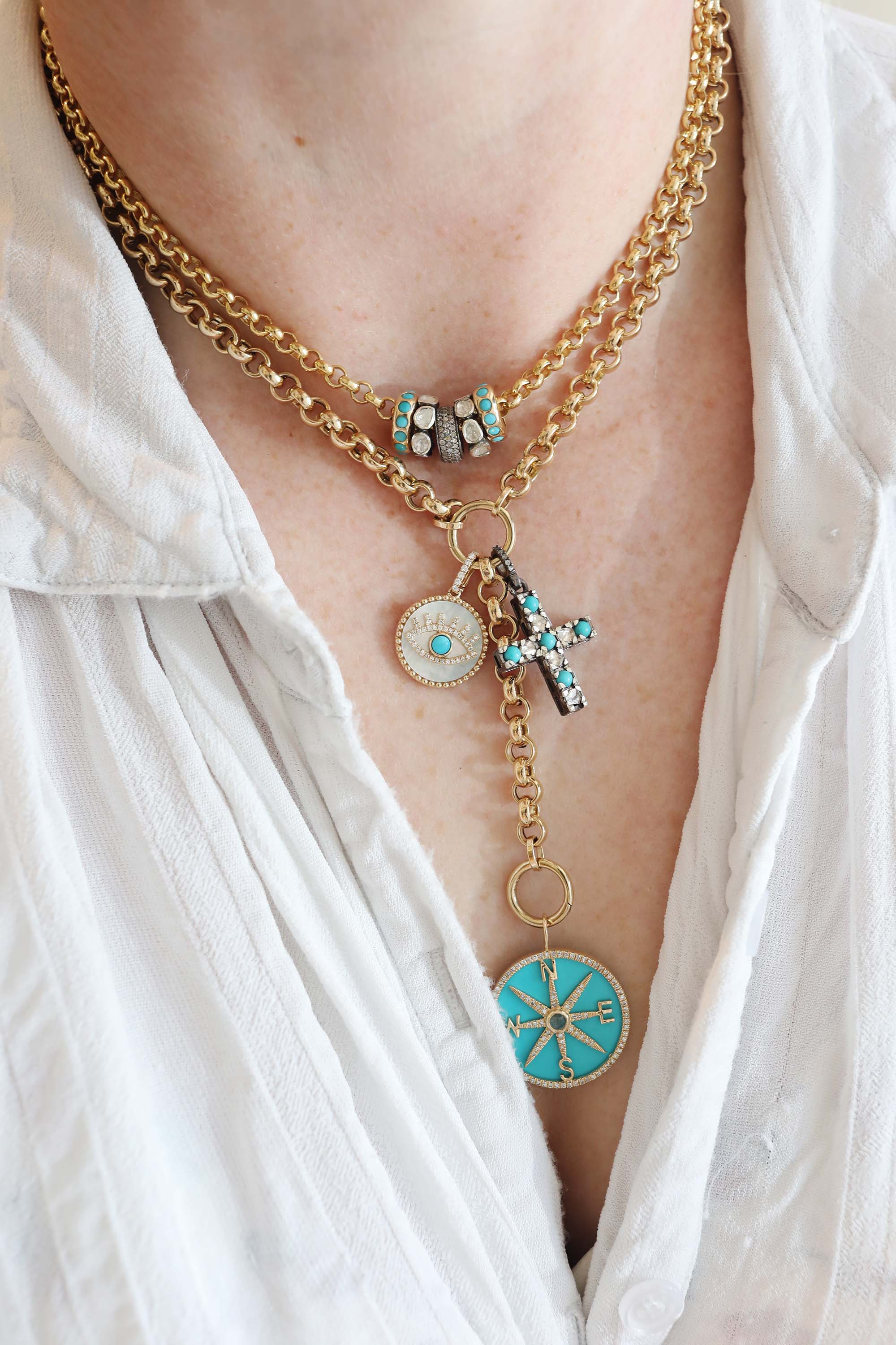 Add some spirituality and color to your neckmess with this polki diamond turquoise cross. Mix your metals!